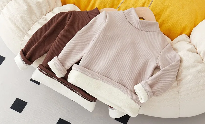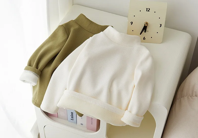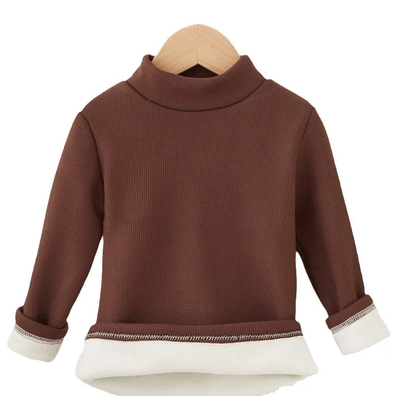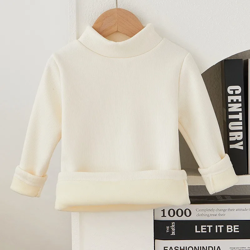 Children's Semi High Neck Plus Velvet Long Sleeved Solid Color Bottom Pants Shirt Suitable For Boys And Girls